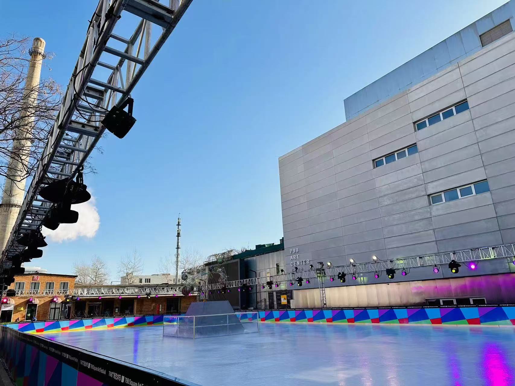 本冰场约为800平,是全天候户外冰场,舞美灯光音响、专业冰场制冷设备、围栏、管道、冰鞋护具头盔等设施、设备由上海古权电子科技有限公司提供和施工。