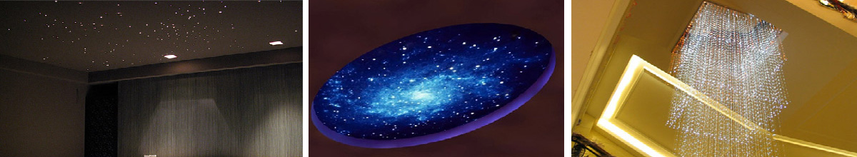 光纤星空系统一般采用150瓦的光源,背景采用天蓝色或者其它背影的星空或者星座绘画,也可以采用具有镜面反射效果的蓝色或者黑色材料,增加星点的反射和光芒效果。光纤亮点可以有颜色的变幻和闪烁效果,另外还可以增加流星的变化效果。