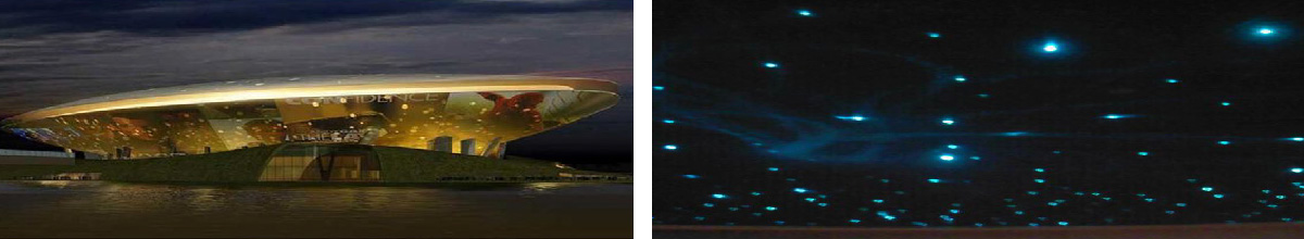 光纤是21世纪的新型节能,环保的装饰照明材料,具有高纯度、低衰减,安装方便,可靠性、安全性、环保性、灵活性、完整性、能产生五颜六色,如梦如幻的视觉效果以及无紫外线、低热量、无电伤害、使用寿命长、色彩变幻丰富、良好的耐久性和可塑性等。完全符合世博演艺中心的健康环保上的要求。