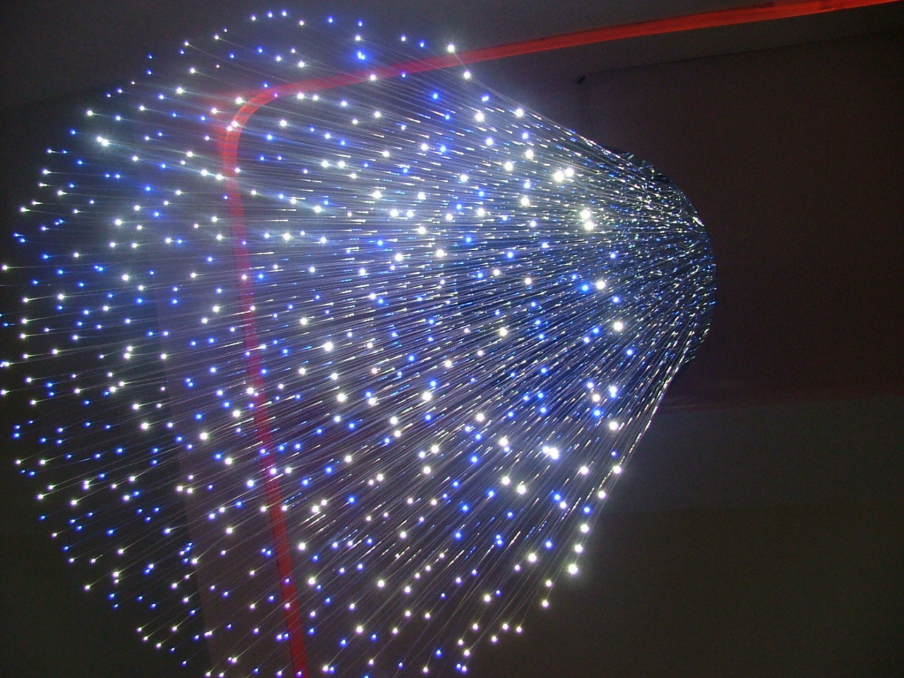 光纤灯照明系统是由光源、反光镜、滤色片及光纤组成。 LED光纤照明可以创造出许多绚烂多彩的效果,如:水晶星空星座、十二星座、流星雨、星空风瀑、流水瀑布、光纤幕墙、垂帘、三维立体镜画等等效果,绚丽多彩、色彩柔和、如梦如幻、精美典雅,是艺术与生活的完美结合,广泛应用于星级酒店、酒吧、夜总会、KTV、迪厅、桑拿、洗浴中心等高档娱乐场所。