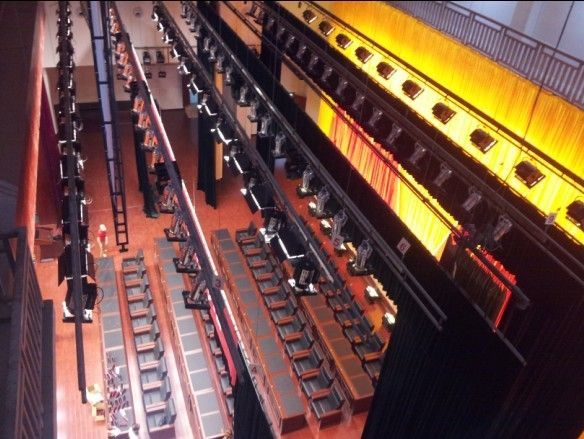灯光排架是布设顶光的机械设备。采用电动曳引式驱动,装灯数量比灯光吊杆多。灯架形式采用三角形桁架或梯形桁架。